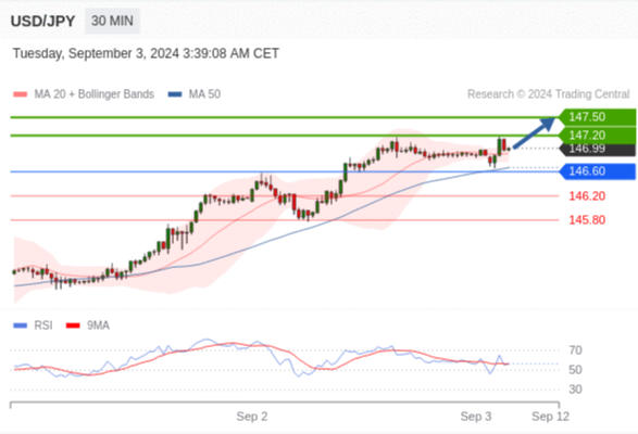 在 146.60 之上,看涨,目标价位为 147.20 ,然后为 147.50 。