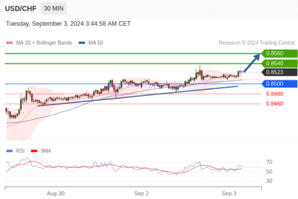 在 0.8500 之上,看涨,目标价位为 0.8540 ,然后为 0.8560 。