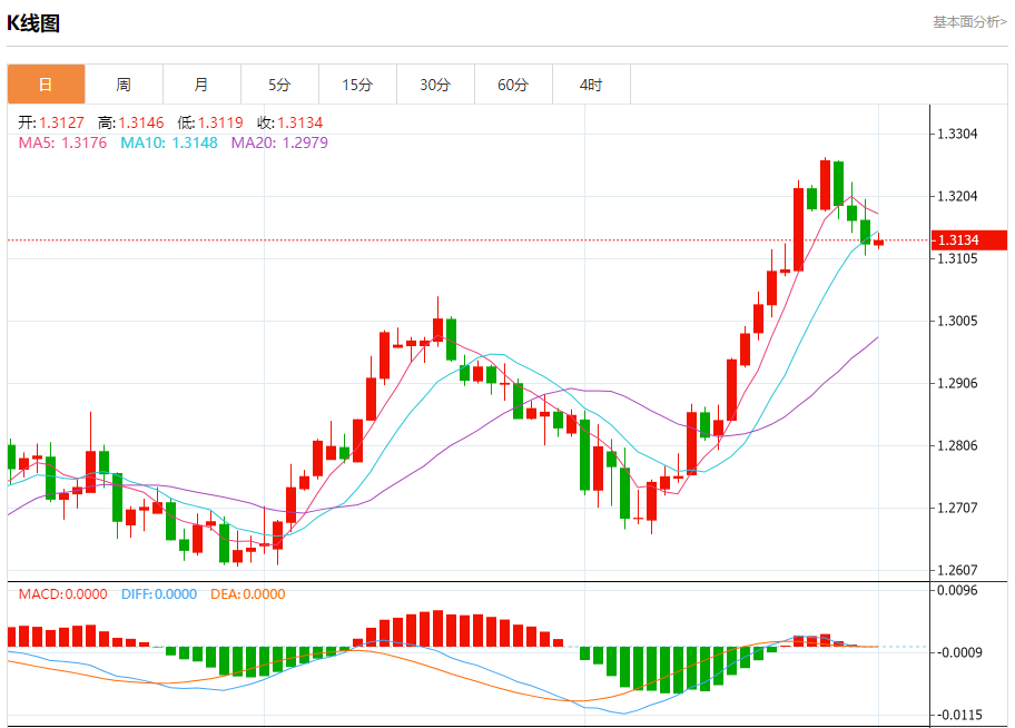 汇价高见1.3145,低见1.3113。上一交易日,汇价收于1.3127。