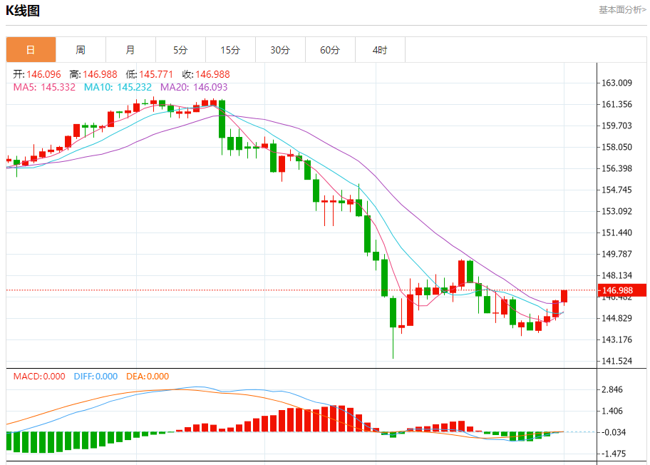 汇价高见146.978,低见145.762。上一交易日,汇价收于146.180。