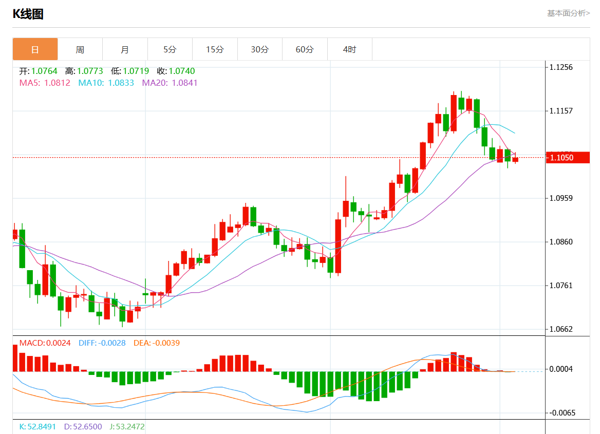 周三欧市盘中,欧元/美元最新报1.1054,日图涨0.11%。