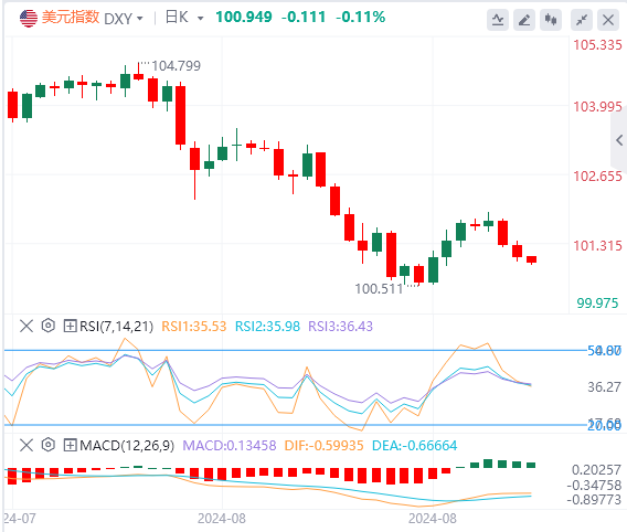 受疲软的美国ADP就业数据打压,追踪美元兑六种主要货币的美元指数(DXY)周四收盘下跌0.23%,至101.06。