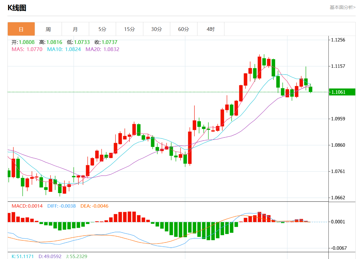 周一欧市盘中,欧元/美元最新报1.1061,日图跌0.21%。