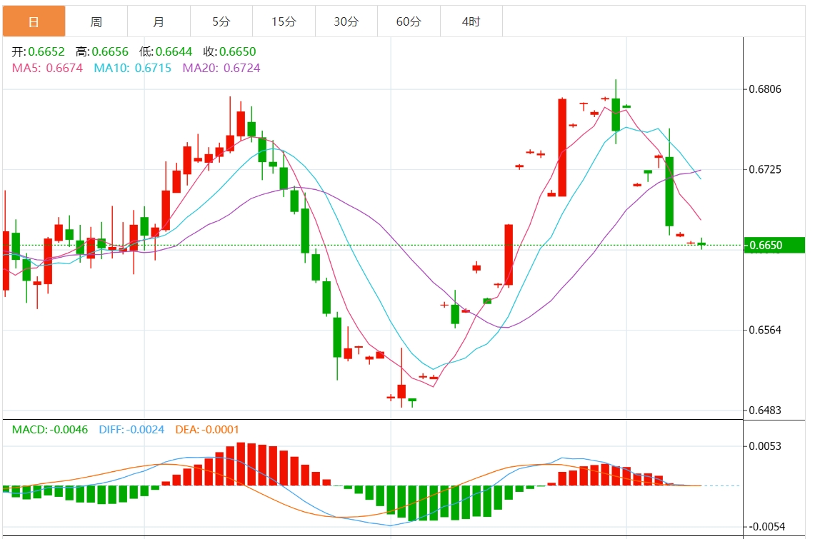 技术分析:澳元在0.6650附近徘徊,其后是下降通道的下边界