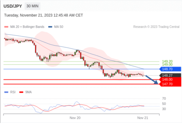 在 148.70 之下,看跌,目标价位为 148.00 ,然后为 147.70 。