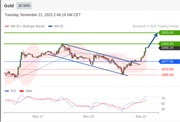 在 1977.00 之上,看涨,目标价位为 1993.00 ,然后为 2003.00 。