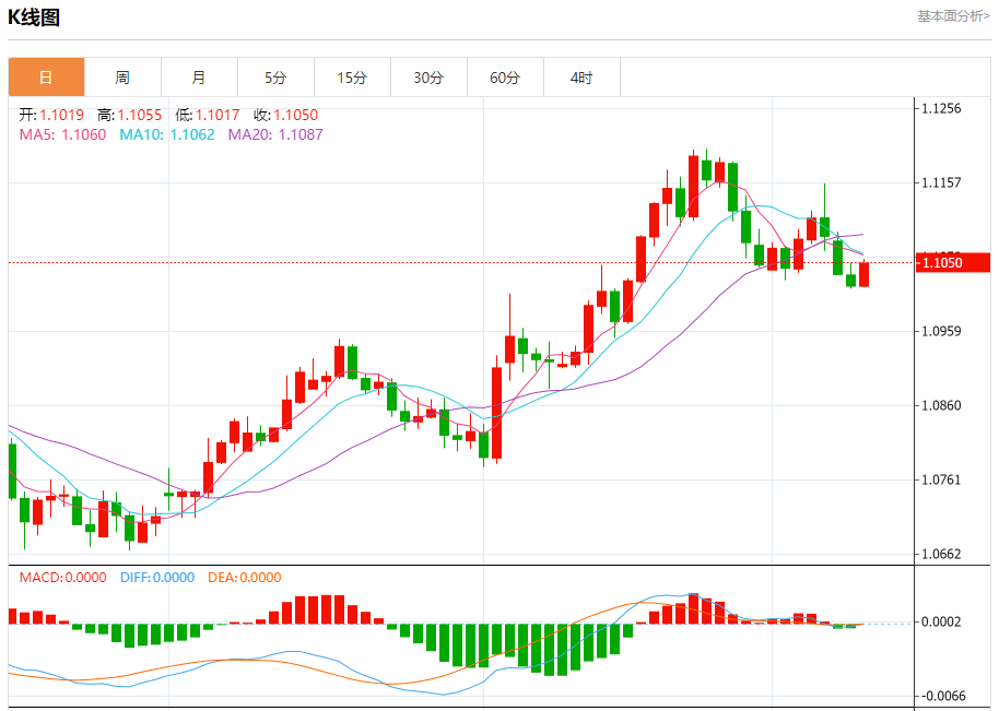 汇价高见1.1055,低见1.1017。上一交易日,汇价收于1.1019。