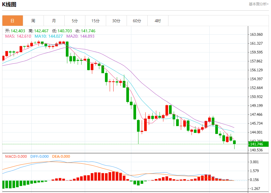 汇价高见142.467,低见140.703。上一交易日,汇价收于142.421。