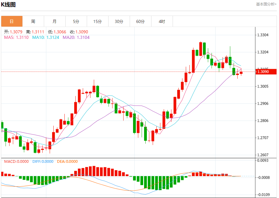 汇价高见1.3111,低见1.3066。上一交易日,汇价收于1.3079。