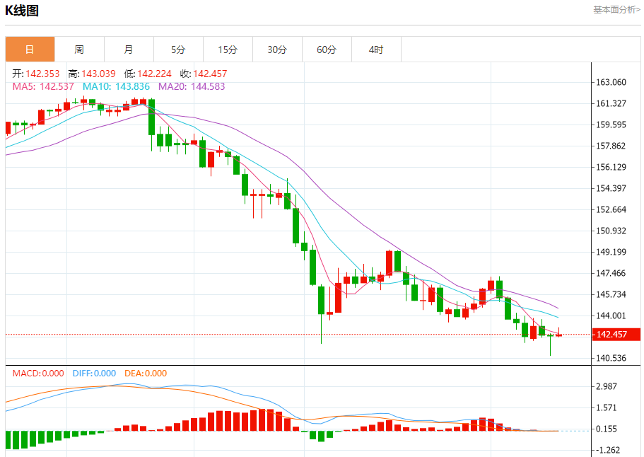 汇价高见143.039,低见142.224。上一交易日,汇价收于142.358。