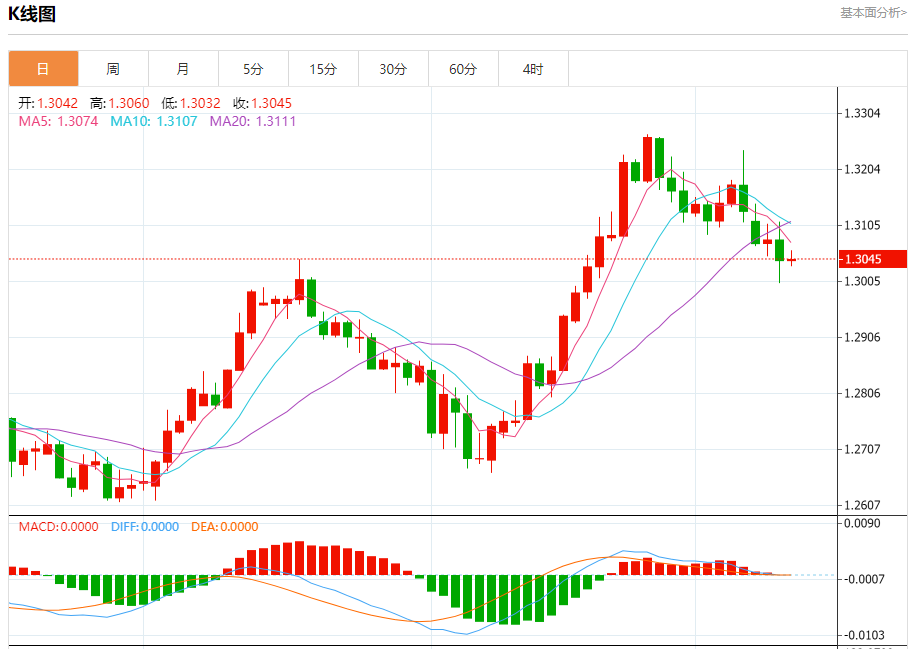 汇价高见1.3060,低见1.3032。上一交易日,汇价收于1.3042。