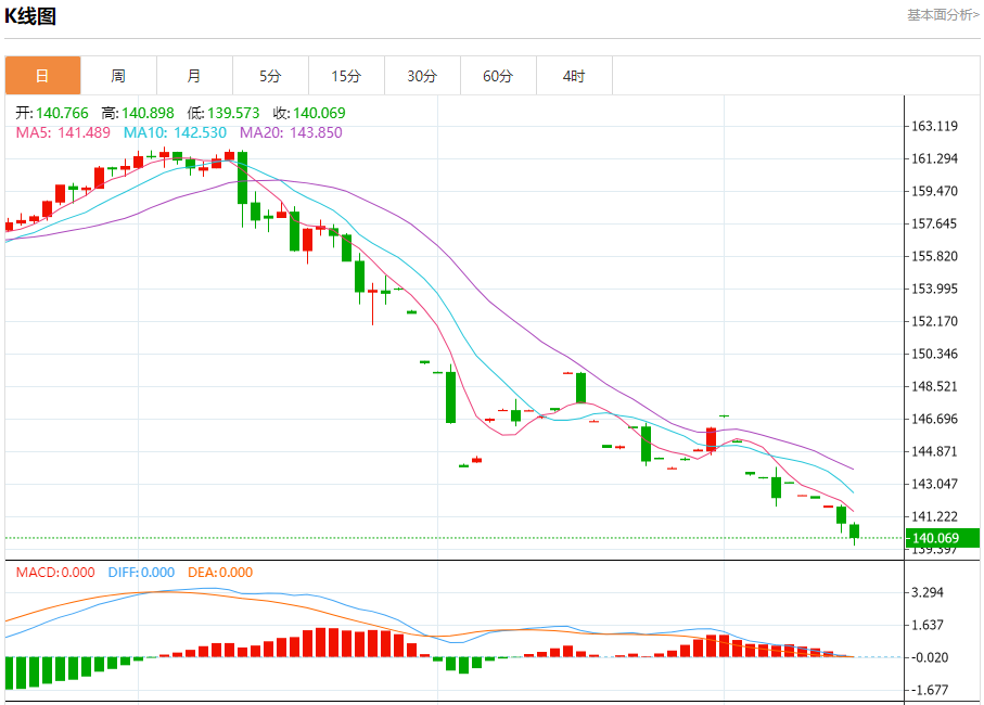 汇价高见140.898,低见139.573。上一交易日,汇价收于140.876。