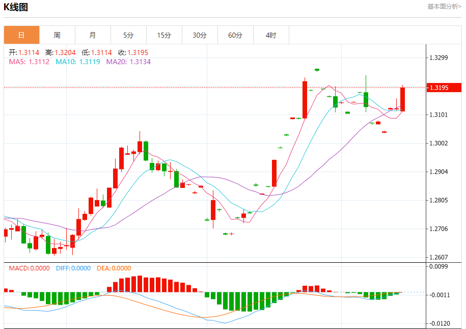 汇价高见1.3204,低见1.3114。上一交易日,汇价收于1.3123。