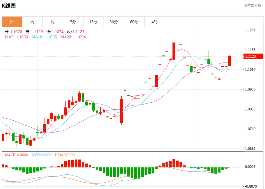 汇价高见1.1129,低见1.1074。上一交易日,汇价收于1.1074。