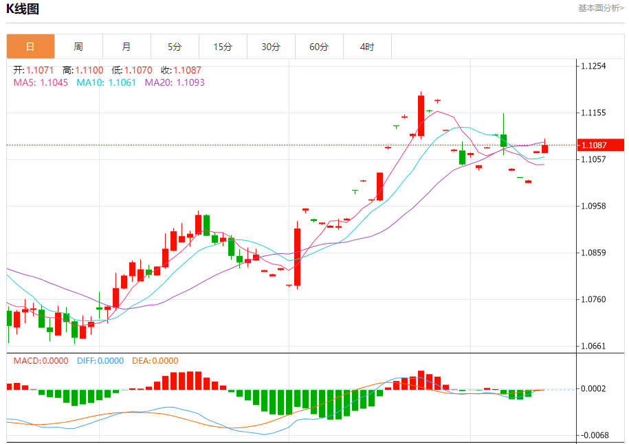 汇价高见1.1101,低见1.1070。上一交易日,汇价收于1.1074。