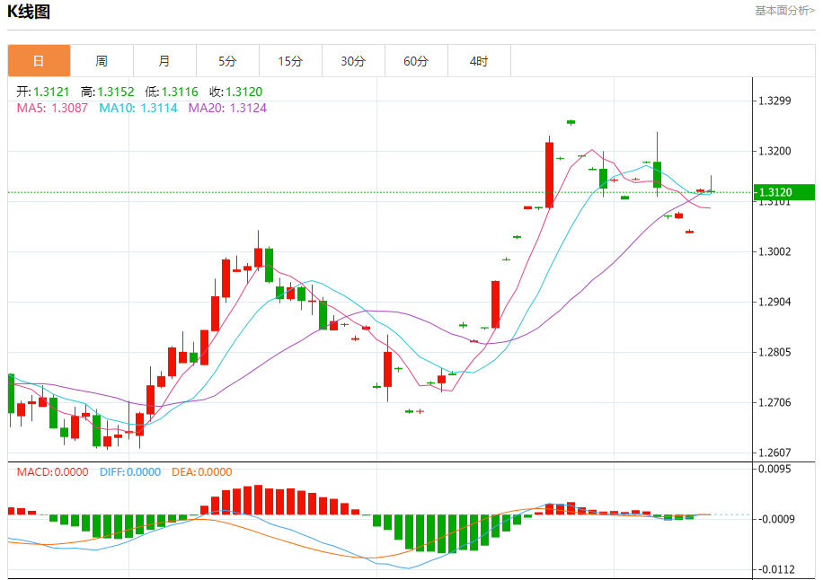 汇价高见1.3152,低见1.3116。上一交易日,汇价收于1.3123。