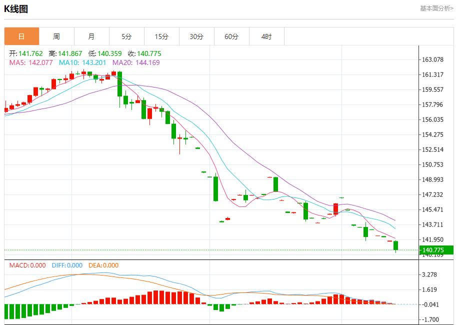 汇价高见141.869,低见140.359。上一交易日,汇价收于141.796。