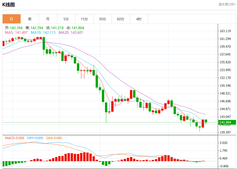 汇价高见142.383,低见141.218。上一交易日,汇价收于142.400。