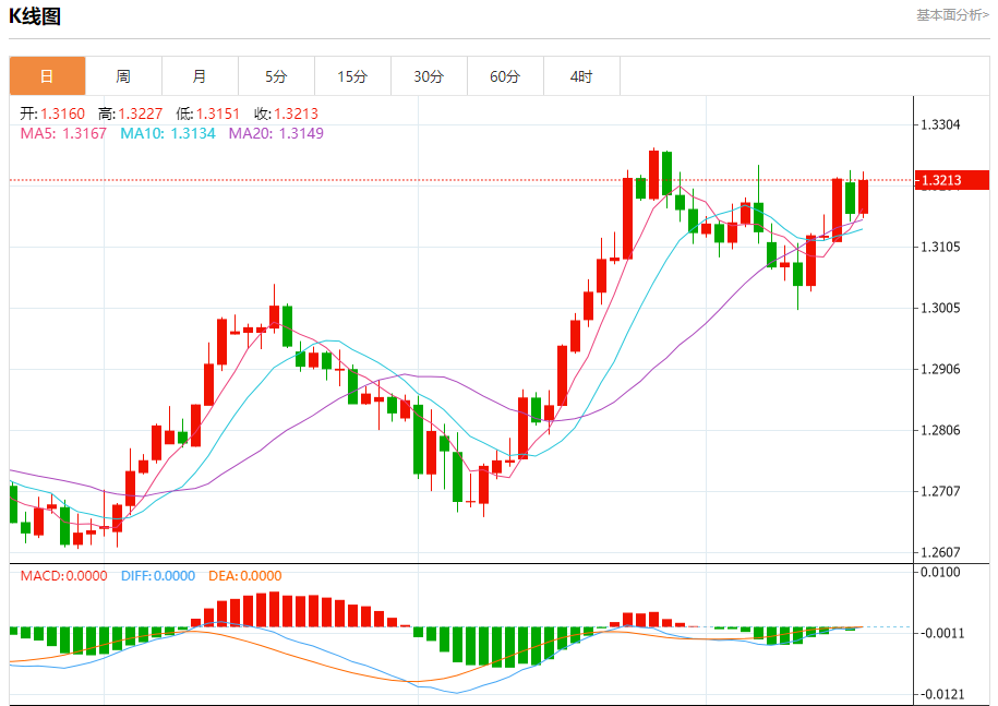 汇价高见1.3227,低见1.3151。上一交易日,汇价收于1.3160。