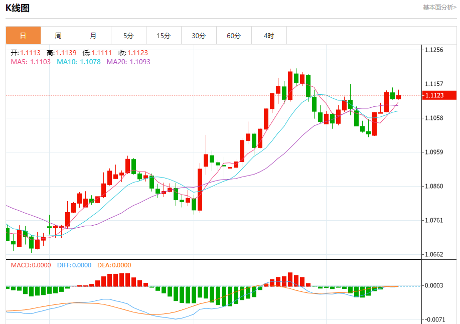 汇价高见1.1140,低见1.1111。上一交易日,汇价收于1.1113。