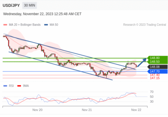 在 147.70 之上,看涨,目标价位为 148.50 ,然后为 148.80 。