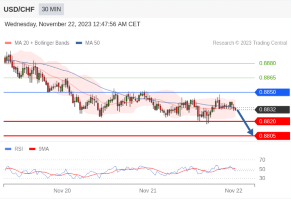 在 0.8850 之下,看跌,目标价位为 0.8820 ,然后为 0.8805 。
