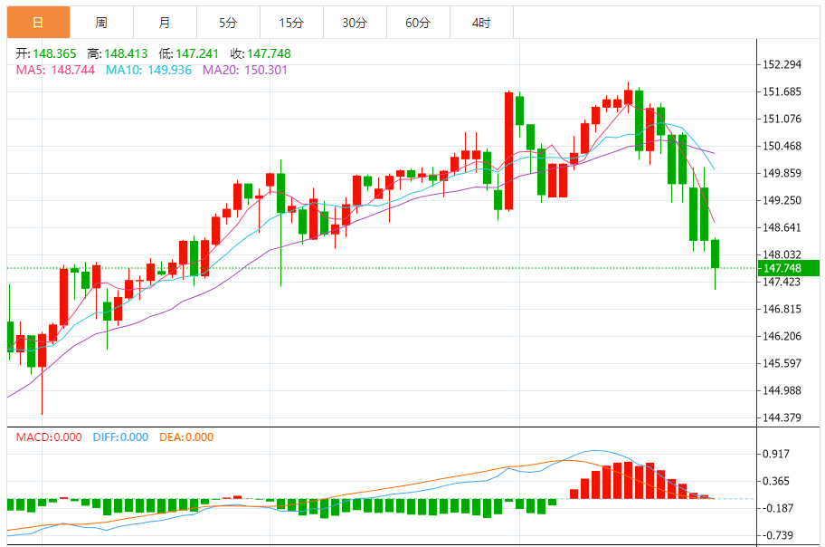 周二(11月21日),美元/日元下跌,暂报147.752,跌幅0.42%。