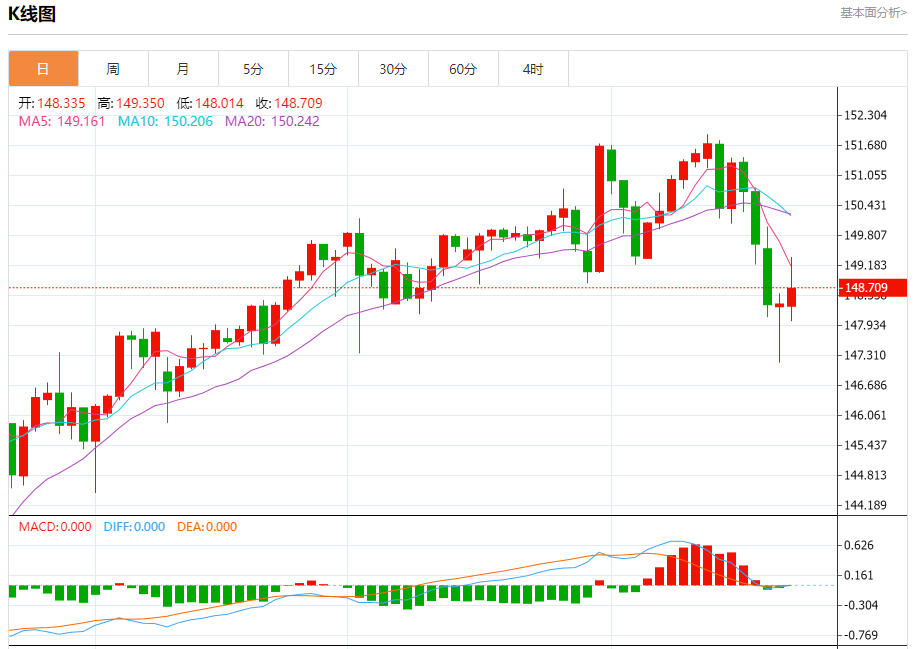汇价高见149.350,低见148.014。上一交易日,汇价收于148.382。