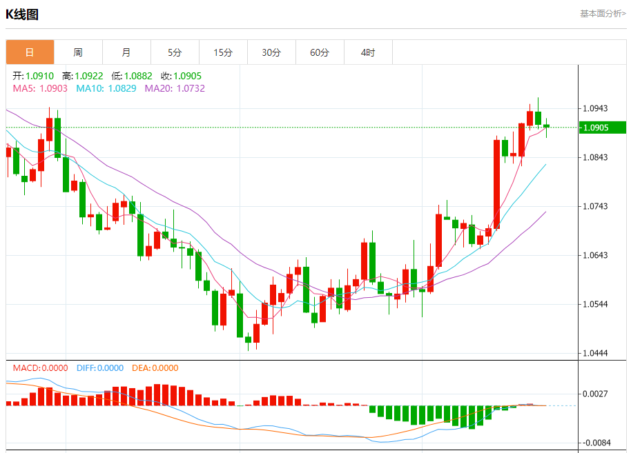 汇价高见1.0923,低见1.0882。上一交易日,汇价收于1.0911。
