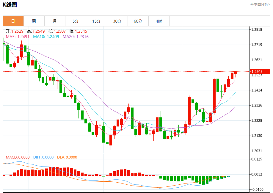 汇价高见1.2549,低见1.2507。上一交易日,汇价收于1.2538。