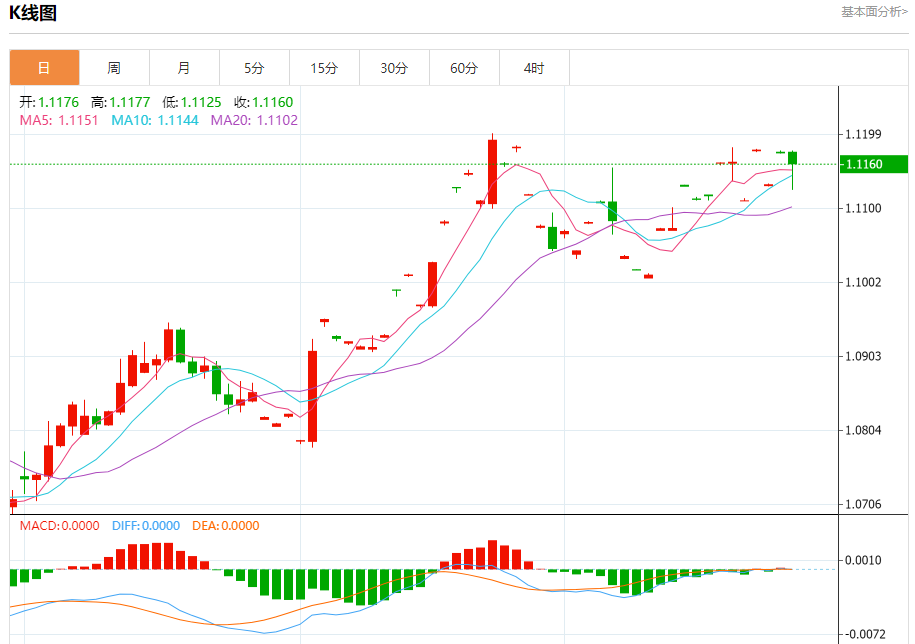 汇价高见1.1177,低见1.1124。上一交易日,汇价收于1.1176。