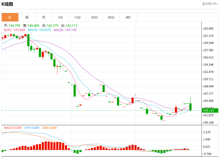汇价高见146.485,低见142.765。上一交易日,汇价收于144.798。