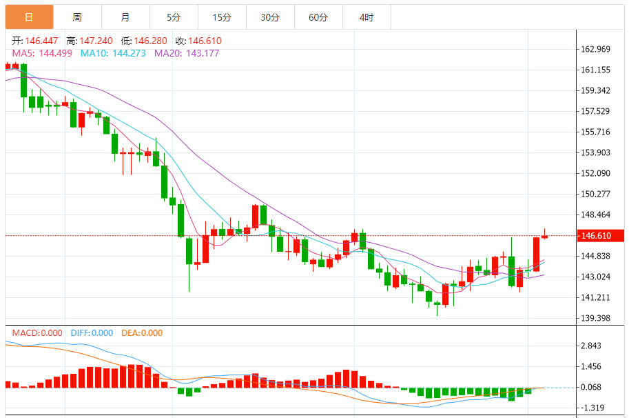 周四(10月3日),美元/日元上涨146.621,暂报146.607,涨幅0.11%。