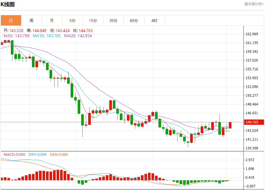 汇价高见144.849,低见143.424。上一交易日,汇价收于143.552。
