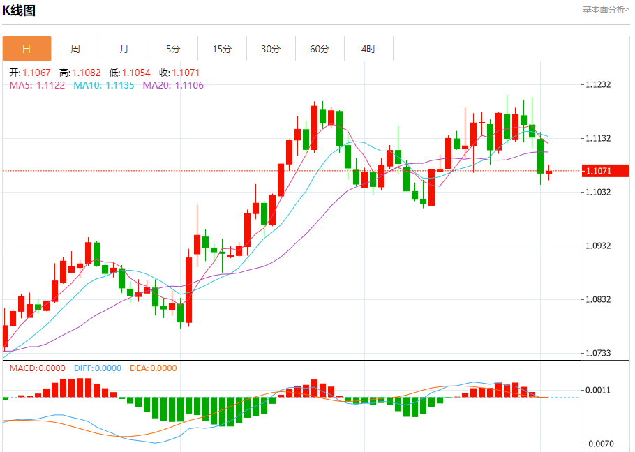 汇价高见1.1083,低见1.1054。上一交易日,汇价收于1.1067。