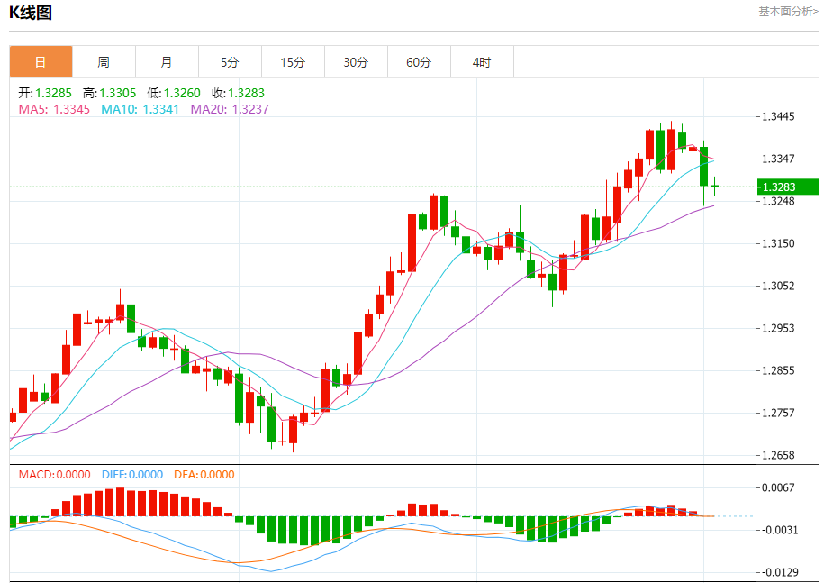 汇价高见1.3305,低见1.3260。上一交易日,汇价收于1.3285。