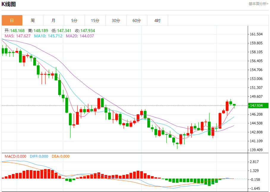 汇价高见148.189,低见147.342。上一交易日,汇价收于148.175。