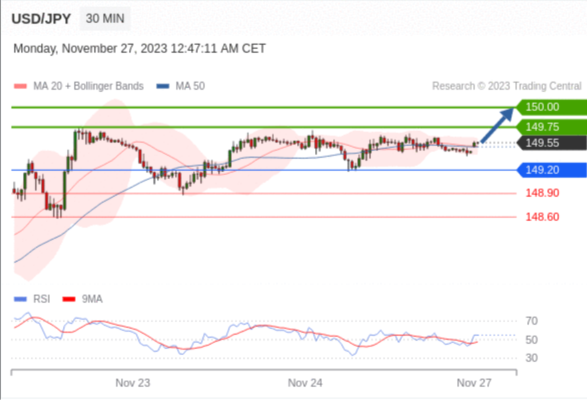 在 149.20 之上,看涨,目标价位为 149.75 ,然后为 150.00 。