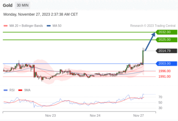 【XM交易平台】2023年11月27日亚盘交易建议:黄金、白银、欧元、英镑、日元、瑞郎交易点位技术分析及预测