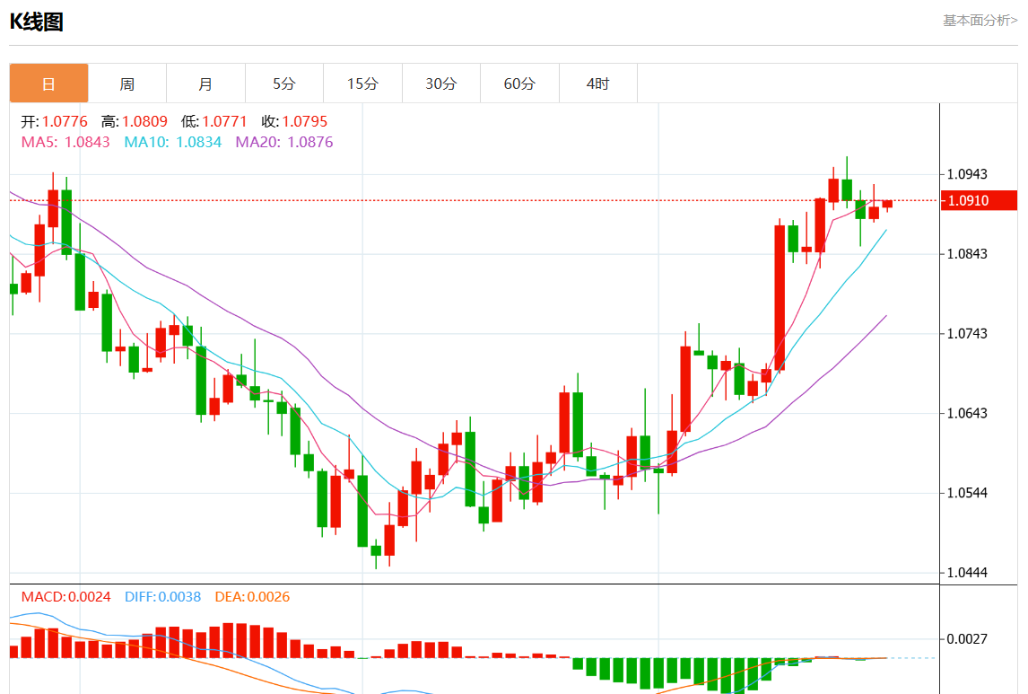 周五欧市盘中,欧元/美元最新报1.0909,日图涨0.06%.
