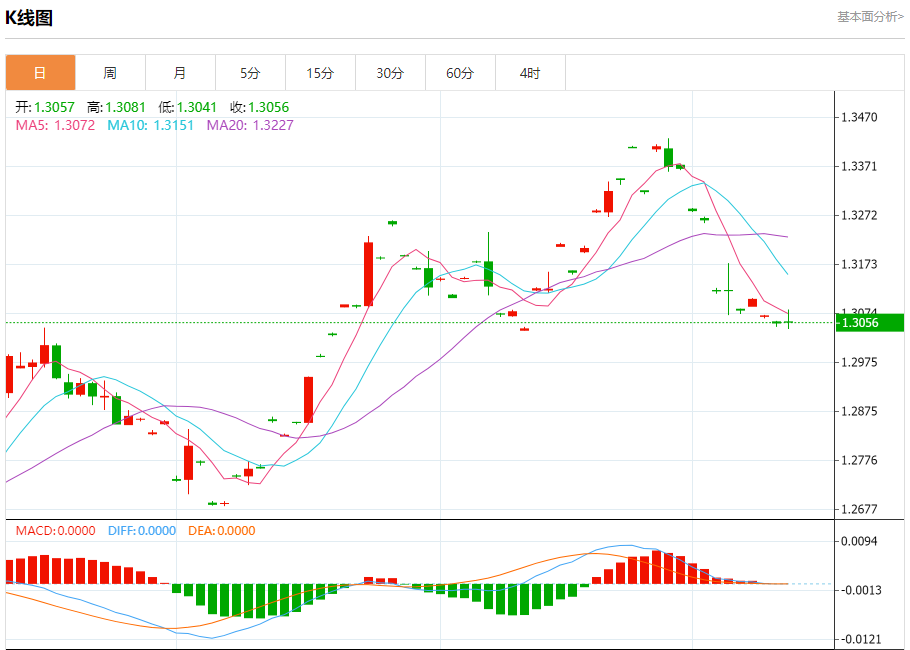 汇价高见1.3081,低见1.3041。上一交易日,汇价收于1.3058。