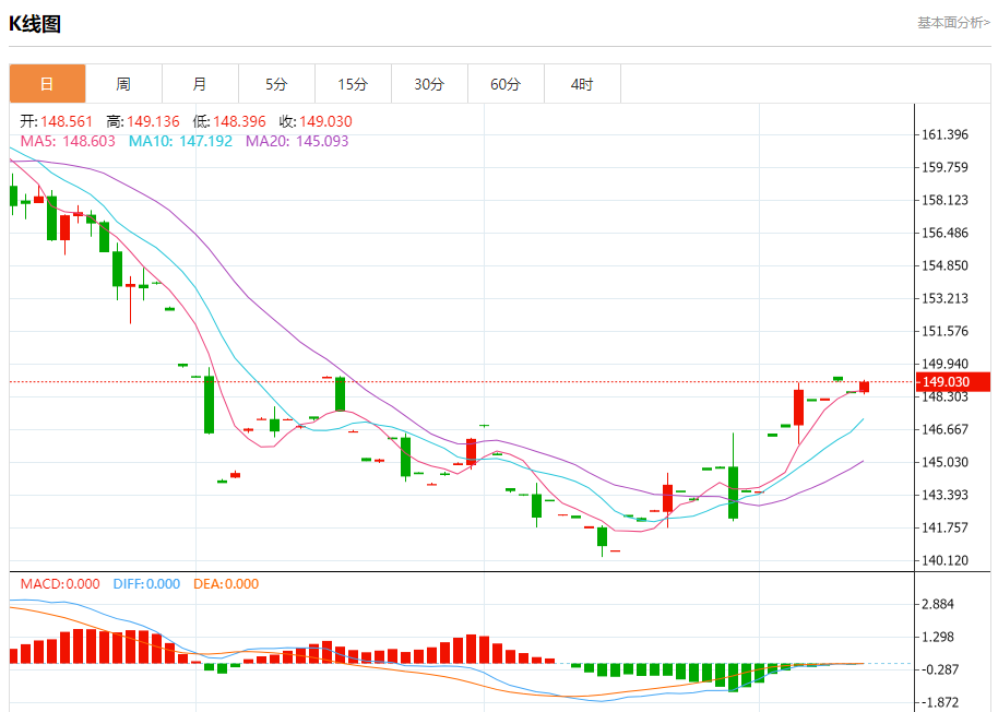 汇价高见149.137,低见148.397。上一交易日,汇价收于148.566。