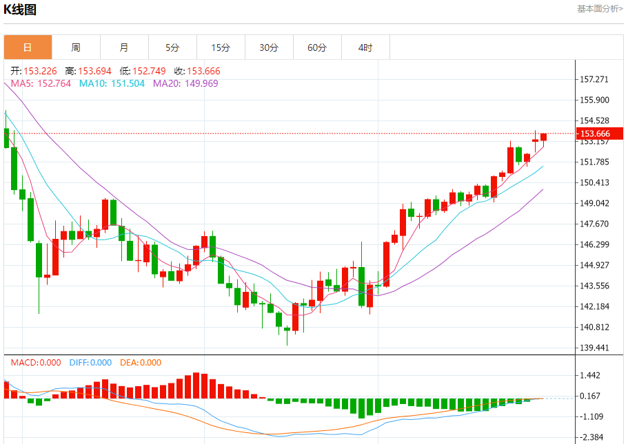 汇价高见153.694,低见152.749。上一交易日,汇价收于153.271。