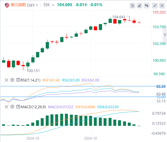 追踪美元兑六种主要货币的美元指数(DXY)周三下跌0.17%,报104.06,盘中一度升至104.43。