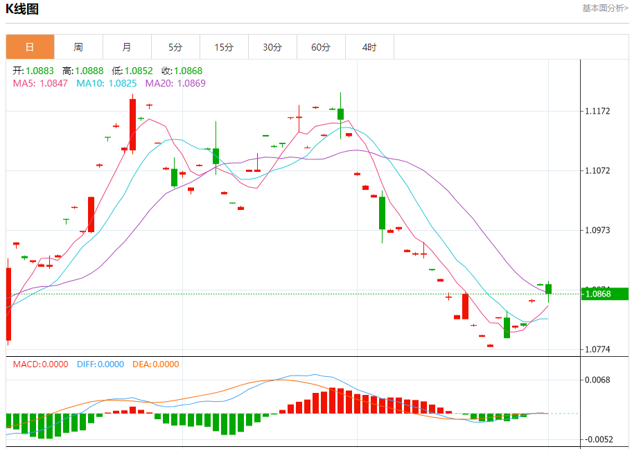 汇价高见1.0888,低见1.0852。上一交易日,汇价收于1.0883。