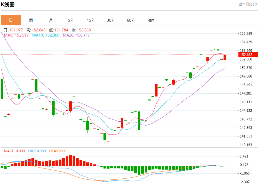 汇价高见152.843,低见151.784。上一交易日,汇价收于152.026。