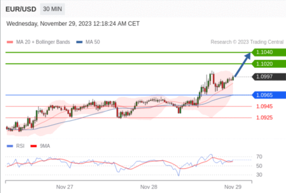 在 1.0965 之上,看涨,目标价位为 1.1020 ,然后为 1.1040 。