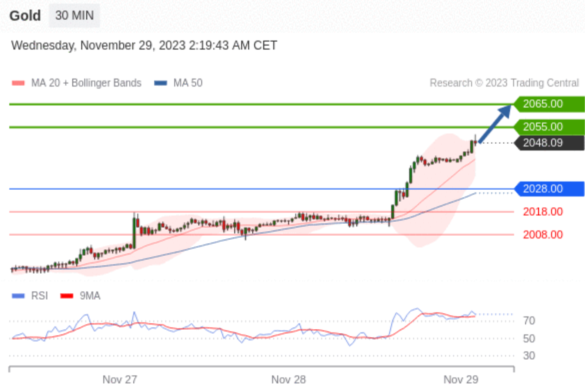 在 2028.00 之上,看涨,目标价位为 2055.00 ,然后为 2065.00 。