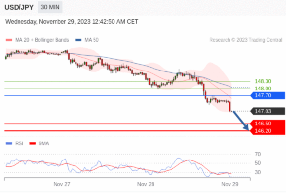 在 147.70 之下,看跌,目标价位为 146.50 ,然后为 146.20 。