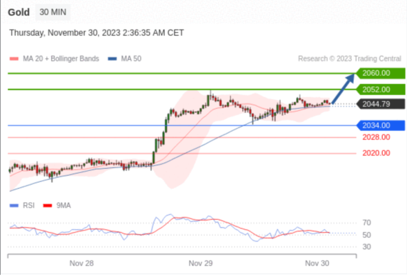 在 2034.00 之上,看涨,目标价位为 2052.00 ,然后为 2060.00 。